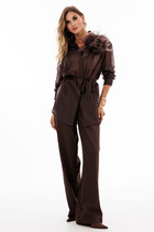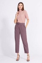 Брюки прямые из струящейся ткани. Верх на поясе со шлевками. По спинке пояс собран на резинку. Застежка по переду на молнию и пуговицу на поясе. В боковых швах карманы.