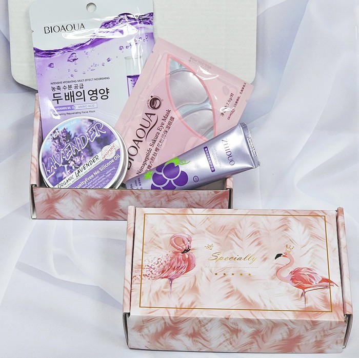 В состав набора входят:, 1. Органический твердый шампунь с экстрактом ЛАВАНДЫ Fresh Plant Shampoo Bar, 60 гр., 2. Крем для рук с виноградом, 30 гр., 3. Маска тканевая для лица с витамином В5 Bioaqua4. Патчи для глаз с экстрактом сакуры, 1 пара., 5. Коробка розовая с цветным принтом размером 10*15 см.