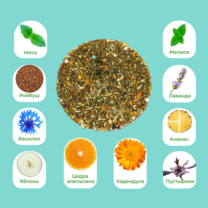 Чай травяной Энергия жизни приятный и свежий вкус этого напитка взбодрит и придаст сил. При заваривании дает настой светло-зеленого цвета с ярким вкусом и ароматом.