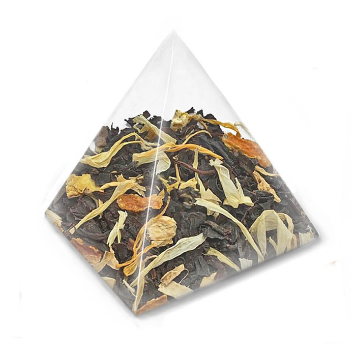 апельсин цедра, имбирь кусочки, календула лепестки, чай черный