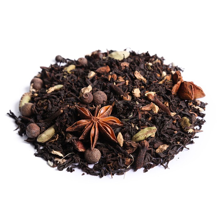 Черный индийский чай со специями: имбирь, корица, перец черный, апельсиновая корка, кориандр молотый, мускатный орех, календула.