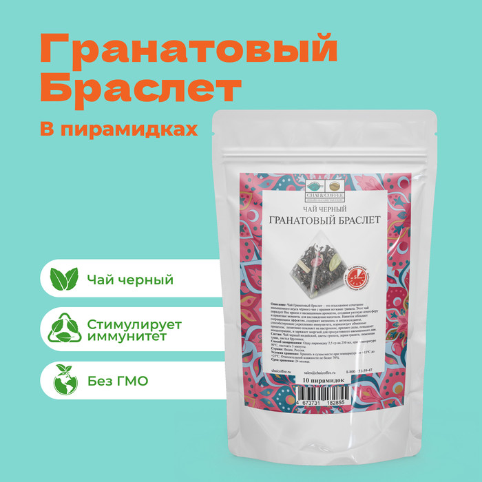 Чай Гранатовый браслет — это изысканное сочетание насыщенного вкуса чёрного чая с яркими нотками граната. Этот чай порадует Вас ярким и насыщенным ароматом, создавая уютную атмосферу и приятные моменты для наслаждения напитком. Напиток обладает согревающим эффектом, содержит витамины и антиоксиданты, способствующие укреплению иммунитета, нормализует обменные процессы, позитивно повлияет на настроение, придает силы, повышает концентрацию, и заряжает энергией для продуктивного насыщенного дня.