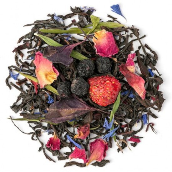Чай черный индийский, ягоды клубники, плоды аронии, каркадэ, листья базилика, лепестки розы, листья бамбука, лепестки василька
