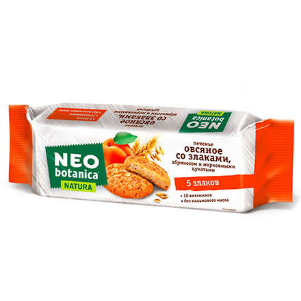 Хрустящее ароматное печенье «Нео Ботаника» со сладкими морковными цукатами и кусочками абрикоса. Хрустящее рассыпчатое печенье из овсяной муки и зерновых хлопьев 5 ценных злаков, в том числе полбы (спельты) – дикой пшеницы, которой питались еще в древней Руси. Яркий морковно-абрикосовый вкус печенья Neo Botanica дополнен пользой витаминного комплекса, куда входят витамины группы B, А, Е, фолиевая кислота и другие полезные микроэлементы.