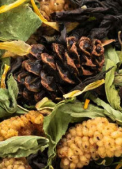 Индийский черный байховый чай, лист брусникики, плоды можжевельника, сосновые почки, кусочки сублимированной клубники, черноплодная рябина. Чай с добавлением молодых сосновых почек помогает при бронхите и простудах, оказывает хорошее отхаркивающее, противовоспалительное и дезинфицирующее действие. Чай оказывает мягкое воздействие на пищеварительный тракт и при этом он нормализует его работу.