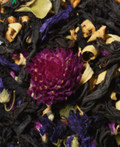 Черный чай с эхиноцеей, чабрецом, кусочками персика и лепестками василька с ароматом персика.