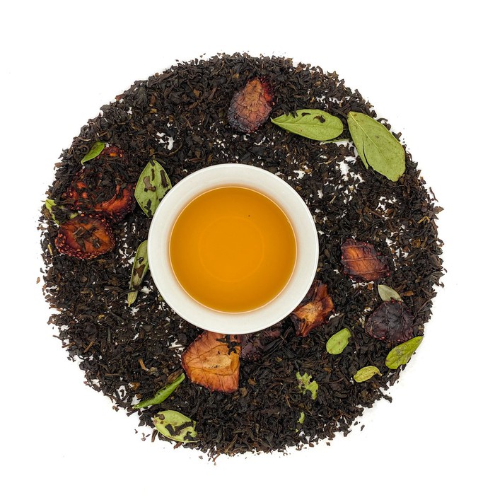 Чай черный, кусочки клубники и листья брусники. Ароматизирован натуральными маслами. Напиток со вкусом идеального дуэта – сочных ягод и сладких сливок.