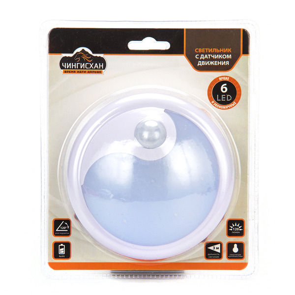ЧИНГИСХАН Светильник с датчиком движения, 6 LED, 1Вт, 4*АА, 12х12х5см