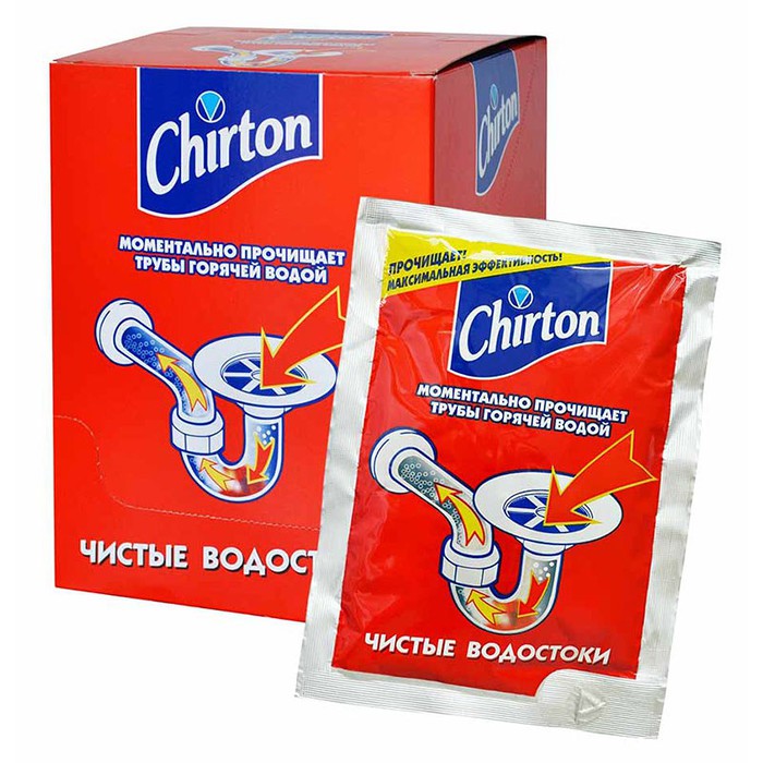 Средство Chirton для прочистки труб горячей водой быстро и эффективно устраняет засоры, а также очищает сливные сифоны и трубы у раковин, моек, ванн, унитазов от окиси, ржавчины и грязи.