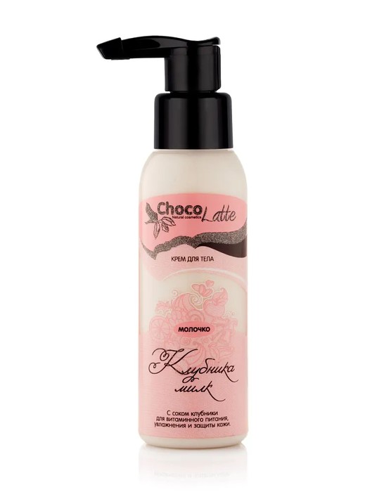 Натуральное молочко для тела КЛУБНИКА-МИЛК ТМ Шоколатте с соком клубники, обогащенное активным увлaжняющим комплексoм экстрактов сeмян oгурца, кoрня лoпуха, грeцкого орeха, крaпивы.