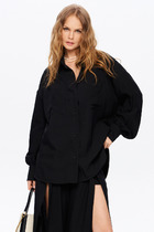 Блузка из вискозного трикотажного полотна джерси, свободного кроя. Втачной короткий рукав. Отложной воротник со стойкой, спереди цельнокроеная планка на пуговицах. Боковые разрезы, нашивка металл.