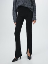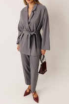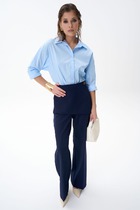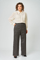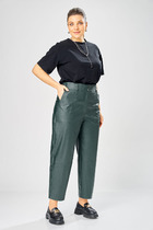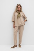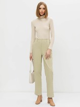 Брюки зауженные из текстильного полотна габардин с добавлением вискозы. Притачной пояс со шлевками, гульфиком и застежкой на молнию, крючок. Боковые карманы с отрезным бочком. По спинке пояс на резинке. Заутюженные стрелки.