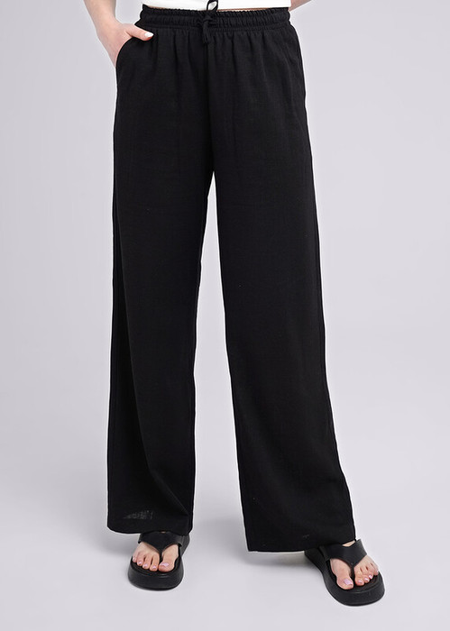 Брюки прямые,широкие из тканого полотна лен с вискозой. По талии притачной пояс на внутренней резинке, в поясе шнур из основной ткани. Боковые карманы в отрезном бочке.