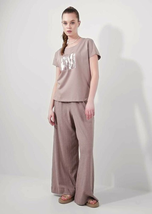 Брюки широкие из фактурного трикотажного полотна джерси. Притачной пояс на внутренней резинке. Боковые карманы в швах. По низу брюк широкая подгибка.