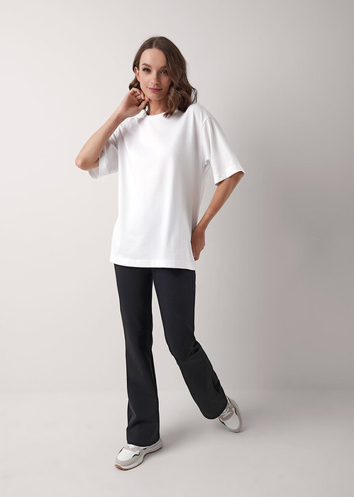 Брюки, расклешенные от колена из футера 2-ух нитки с эластаном. Брюки на высокой посадке с притачным поясом, с прилеганием в верхней части изделия.