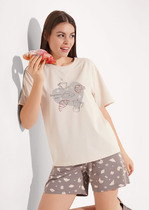 Брюки для дома из трикотажного полотна футер 2х-нит. По переду и спинке декоративные резы. Спереди накладные карманы,принт. По талии притачной пояс на внутренней резинке,вшивка по спинке. По низу изделия манжет с внутренней резинкой.