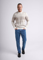 Джемпер прямого силуэта с круглым вырезом горловины. По бейке горловины полосы контрастного цвета. По спинке стильная обтачка контрастного цвета из поплина . Изделие выполнено из натуральной пряжи. Хорошо смотрится с джинсами или брюками.