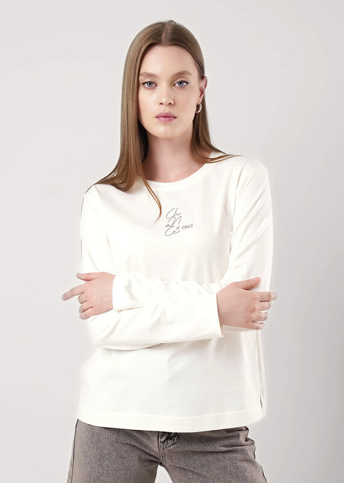 Фуфайка прямого силуэта из хлопкового трикотажного полотна. Втачной длинный рукав. Округлая горловина с контрастной обтачкой. По бокам разрезы. Спереди принт с вышивкой.