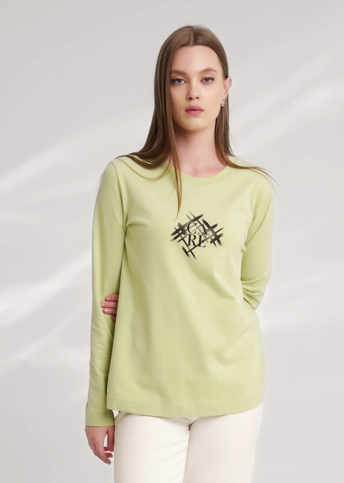 Фуфайка прямого силуэта из хлопкового трикотажного полотна с эластаном. Длинный втачной рукав. Округлая горловина с обтачкой. На детали переда принт.