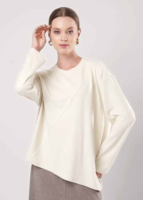 Джемпер объёмный из поливискозного трикотажного полотна джерси. Спущенный длинный рукав. Округлая горловина с двойной вязаной обтачкой. По переду декоративные защипы. Фигурный низ изделия.