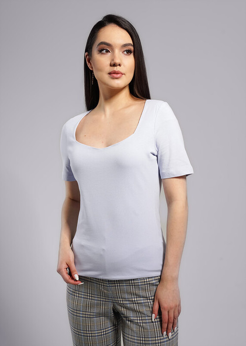 Джемпер из трикотажного полотна с эластаном- кулирная гладь. Втачной короткий рукав. Двойной перед. Фигурный вырез горловины.