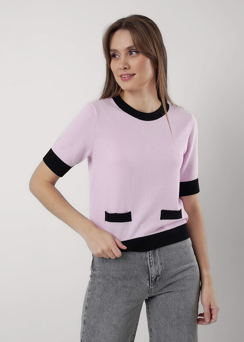 Джемпер из вискозной пряжи с добавлением нейлона,переплетение гладь. Короткий втачной рукав. Спереди имитация кармана листочка. По низу изделия, рукавов манжеты. Бейка горловины, манжеты и листочка - контрастного цвета, нашивка металл.