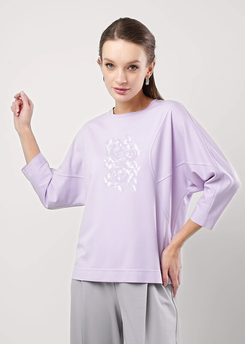 Джемпер свободного кроя из вискозного трикотажного полотна. Округлая горловина с обтачкой. Цельнокроеный рукав длиной 3/4. По переду и спинке отстроченные резы. По спинке средний шов. По бокам небольшие разрезы. Спереди принт фольга.