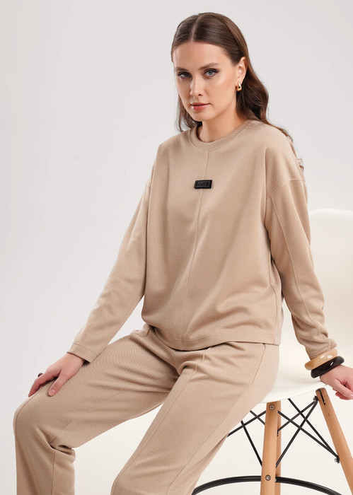 Джемпер объёмный из трикотажного полотна пике жаккард. Округлая горловина с обтачкой. По переду средний шов, нашивка. Длинный спущенный рукав, по рукаву резы. Средний шов, пройма и резы отстрочены.