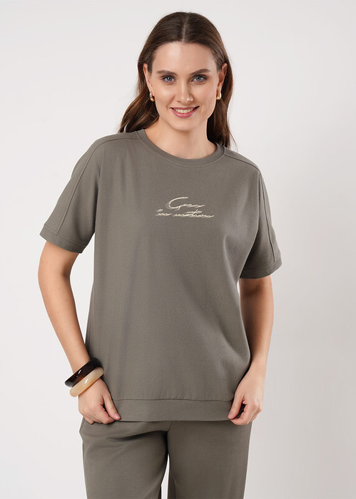 Джемпер свободного объема из трикотажного полотна. Округлая горловина с обтачкой из кашкорсе. Короткий цельнокроеный рукав, по низу манжет. По спинке кокетка со складкой. По низу изделия манжет. Спереди принт с вышивкой.