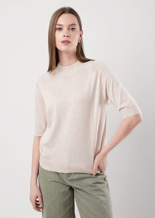 Вязаный джемпер прямого силуэта акриловой пряжи с добавлением хлопка, переплетение гладь. Короткий рукав реглан. Округлая горловина с полустойкой. По низу изделия и рукавов манжеты.