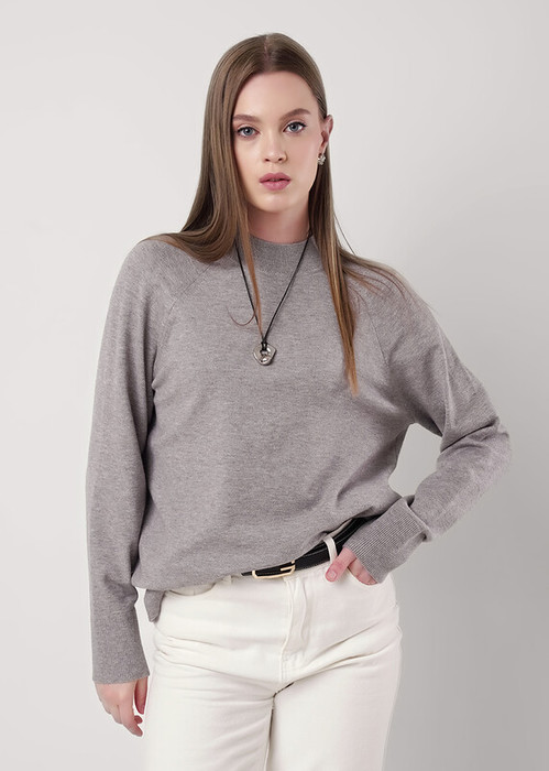 Вязаный джемпер свободного силуэта из вискозной пряжи, переплетения гладь. Длинный рукав реглан. Округлая горловина стойка без загиба. По низу изделия и рукавов манжеты. Спереди нашивка металл.