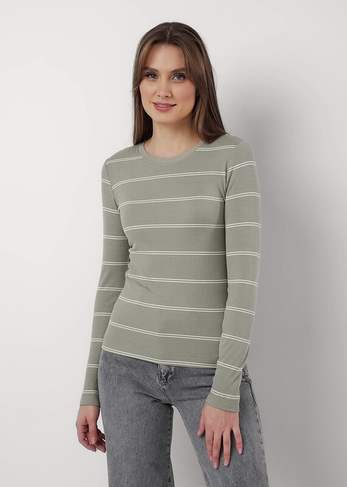 Фуфайка из эластичного трикотажного полотна кошкорсе в полоску. Округлая горловина с обтачкой. Длинный втачной рукав.