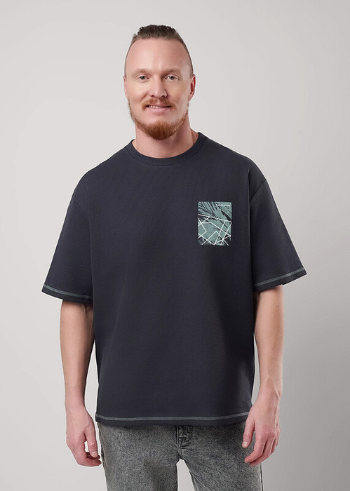 Футболка свободного кроя с круглым вырезом горловины и коротким рукавом. Модель выполнена из фактурного трикотажного полотна. Акцент изделия- дизайнерский принт и контрастные отделочные строчки. Универсальная вещь мужского гардероба на каждый день.