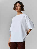 Джемпер оверсайз из хлопкового трикотажного полотна. Короткий втачной рукав. Круглый вырез горловины обработан рибаной. По бокам разрезы. По переду термонаклейка.