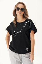 Джемпер из трикотажного полотна футер 2-х нит. Свободного прямого кроя. Втачной короткий рукав. Округлая горловина с вязаной обтачкой. По низу изделия спинки подгибка с внутренней резинкой. Спереди принт.