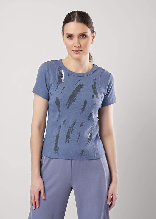 Футболка из хлопкового трикотажного полотна кашкорсе. Умеренный объем. Короткий втачной рукав. Округлая горловина с окантовкой. По переду и верху спинки отстроченные резы. Спереди принт.