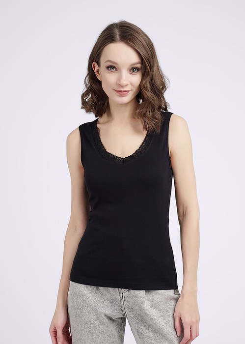 Базовая, малообъемная майка из трикотажного, эластичного полотна. V-образная горловина обработана кружевом. Широкая бретель. Производство Узбекистан.