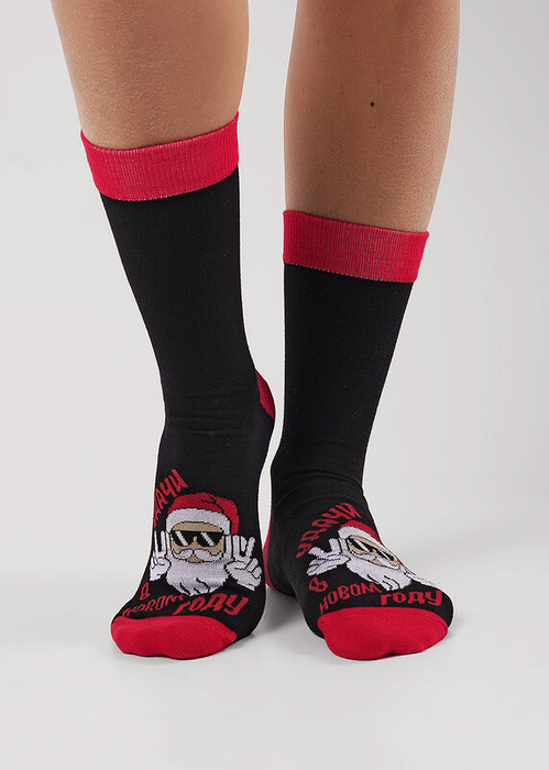 носки мужские с выделенным мыском и пяткой и бортом , с рисунком лицо деда мороза и надписью удачи в новом году