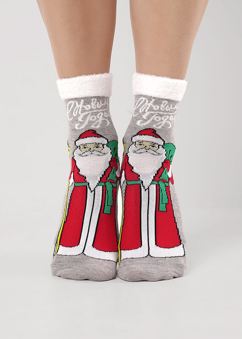 женские носки с рисунком деда мороза, надписью с новым годом, борт выполнен из пряжи травка