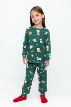 Новогодняя пижама для подростков,состоящая из футболки и брюк. Футболка свободного кроя спереди украшена милым тематическим принтом. Брюки прямые среднего объема с эластичным поясом.
