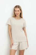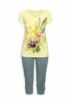 Пижама для дома и отдыха из трикотажного полотна с добавление модала.Футболка прямого кроя, короткий цельнокроенный рукав.Округлая горловина с обтачкой. Спереди принт,нашивка металл. Шорты с поясом на внутренней резинке.Боковые карманы с отрезным бочком.