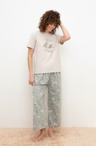 Пижама для дома из хлопкового трикотажного полотна.Футболка прямого кроя. Округлая горловина с обтачкой из кашкорсе. Короткий втачной рукав. На спинке внутренняя кокетка, застил. Шорты короткие,свободные. По талии притачная резинка жаккард, нашивка.