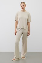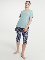 Пижама для дома из хлопкового трикотажного полотна. Майка прямого силуэта, на узких бретелях. По горловине и пройме окантовка. Короткие шорты свободного кроя, цельнокроеный пояс на внутренней резинке.