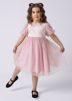 Нарядное двухслойное платье для девочки. Объемные рукава выполнены из сетки с узором. Нижний слой платья - из кулирки 100% хлопок, верхний слой - из сетки, как на рукавах. Сзади платья функциональная атласная лента.