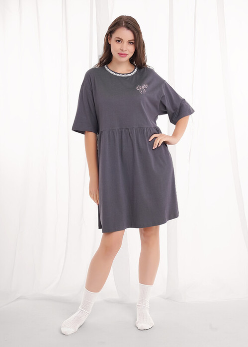 Платье свободного силуэта из хлопкового трикотажного полотна с добавлением модала. Короткий слегка спущенный рукав. По горловине обтачка с кружевом. По талии рез с присборенной юбкой. По бокам узкое кружево 2 ряда. Спереди нашивка, сзади принт.