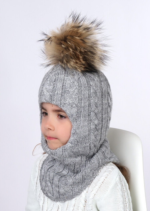 Шапка-шлем выполнен фактурным переплетением ""косы"", в области шеи - ластичная ножка для более плотного прилегания. Модель на синтепоне с хлопковым подкладом и натуральным помпоном на кнопке.