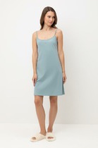 Сорочка ночная для дома и отдыха из хлопкового трикотажного полотна, А-силуэта, без рукавов. По горловине и пройме обтачка. Рельефы по переду. На детали переда принт вспенка, внизу нашивка кокос.
