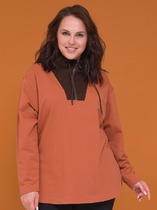 Джемпер комбинированный из эластичного футера 2х нитки. Длиный рукав со спущенной линией плеча. Воротник стойка с застежкой на молнию. По переду и спинке отрезные кокетки. Низ изделия и рукавов на манжете с резинкой. Принт на правом рукаве.