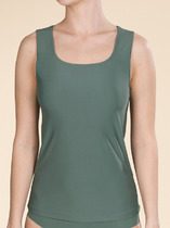 Майка женская укороченная из эластичного хлопкового полотна. V-образный вырез горловины по переду обработан узким кружевом. По пройме окантовка. По низу изделия пояс с внутренней резинкой, обработка ""зубы"".