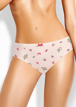 Бикини из однотонного хлопкового полотна. Модель удобной посадки. По поясу и ножкам обработаны резинкой с фестоном. На детали переда расположены симметричные кружевные вставки, отделка кружевной тесьмой. Спереди по центру - небольшой бант.